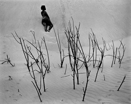 In "Nude On Dunes, 1939" the flat lighting washes out the feeling of three-dimensionality of the space. The spike-like protrusions of the sticks in the foreground almost pierce the nude body in the upper left corner of the photograph. The faint vulgarity of the pose of the model adds to the overall disquieting effect.