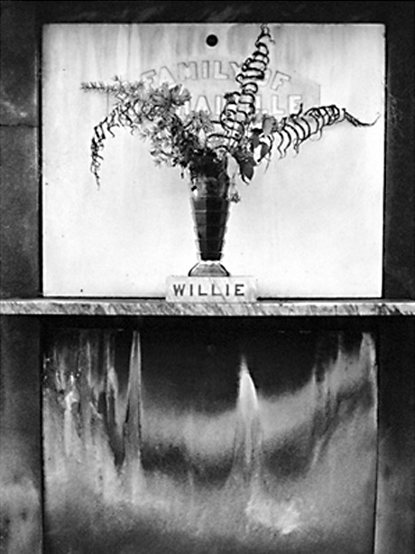 In "Willie, New Orleans, 1941", the photograph consists of two rectangular flat surfaces, each of which could have made a separate photograph. The bottom one is like a reprise from the sensuous rock surfaces of Point Lobos, the top one is a flat perspective "still-life" of a vase against a marble slate. Yet this is, in fact, a close-up of a tombstone found and photographed as weather and wind had scarred it.